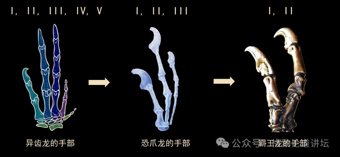 我们都知道,很多恐龙是5根手指,比如这张图上最左边叫异齿龙的恐龙就有5根手指,其中外侧的2根手指也就相当于我们人类的小拇指和无名指,是高度退化的。恐龙逐渐演变,变成4根手指、3根手指的恐龙,然后变成2根手指的霸王龙。这样的过程在这张图上一目了然。