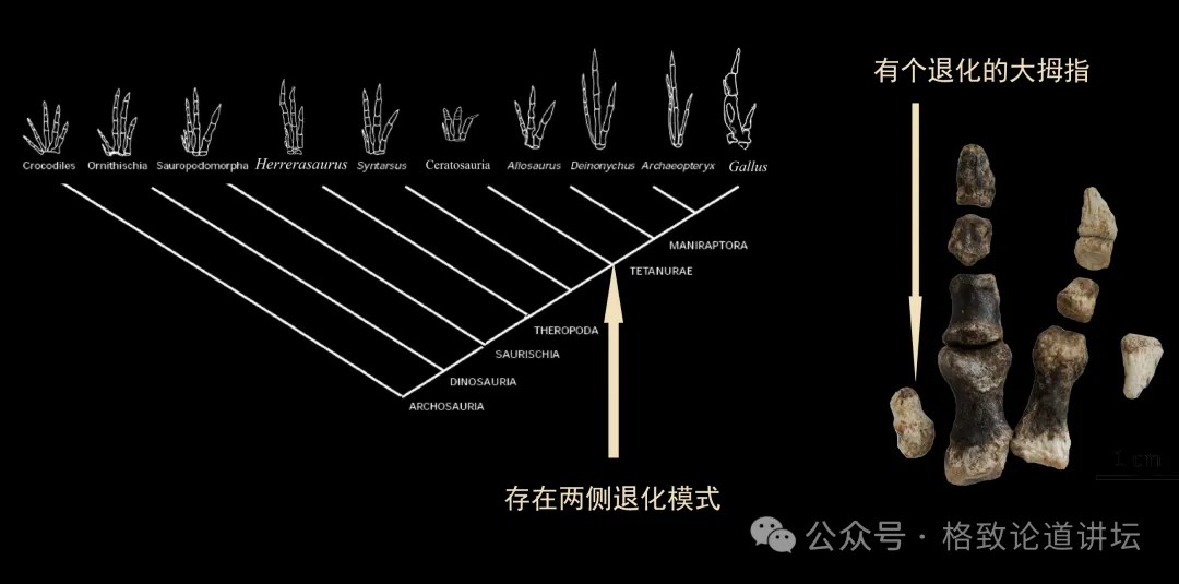 简单来说,确实有大量的数据表明,在手指退化过程当中,恐龙手指是从外侧开始退化的,也就是从小拇指开始的。但是,有些恐龙,比如我们找到的这种恐龙,它的大拇指是高度退化的,这是在我们熟悉的恐龙世界当中是特例。