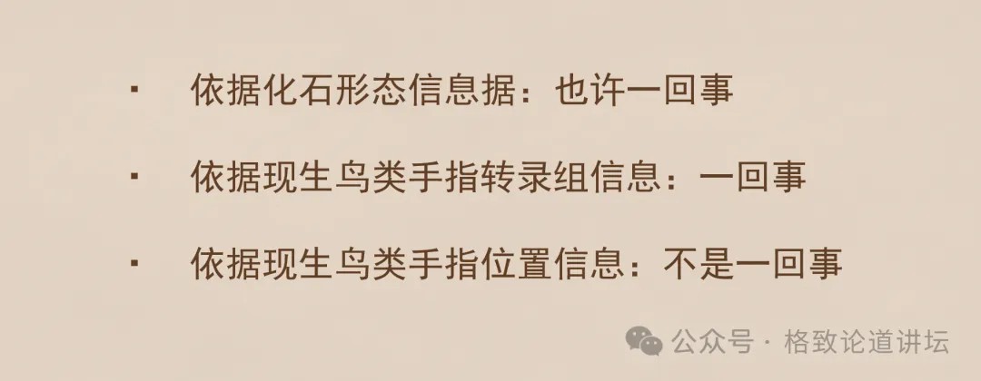 我要讲的是另一个问题,对于现在大多数科学家来说,面对同样的化石数据,我们并不关心,也并不认为它跟恐龙是不是鸟类的祖先这一问题相关,而是跟另外一个更好的科学问题相关:为什么古生物学的数据与胚胎学和发育学的数据会得出不同的同源判断?