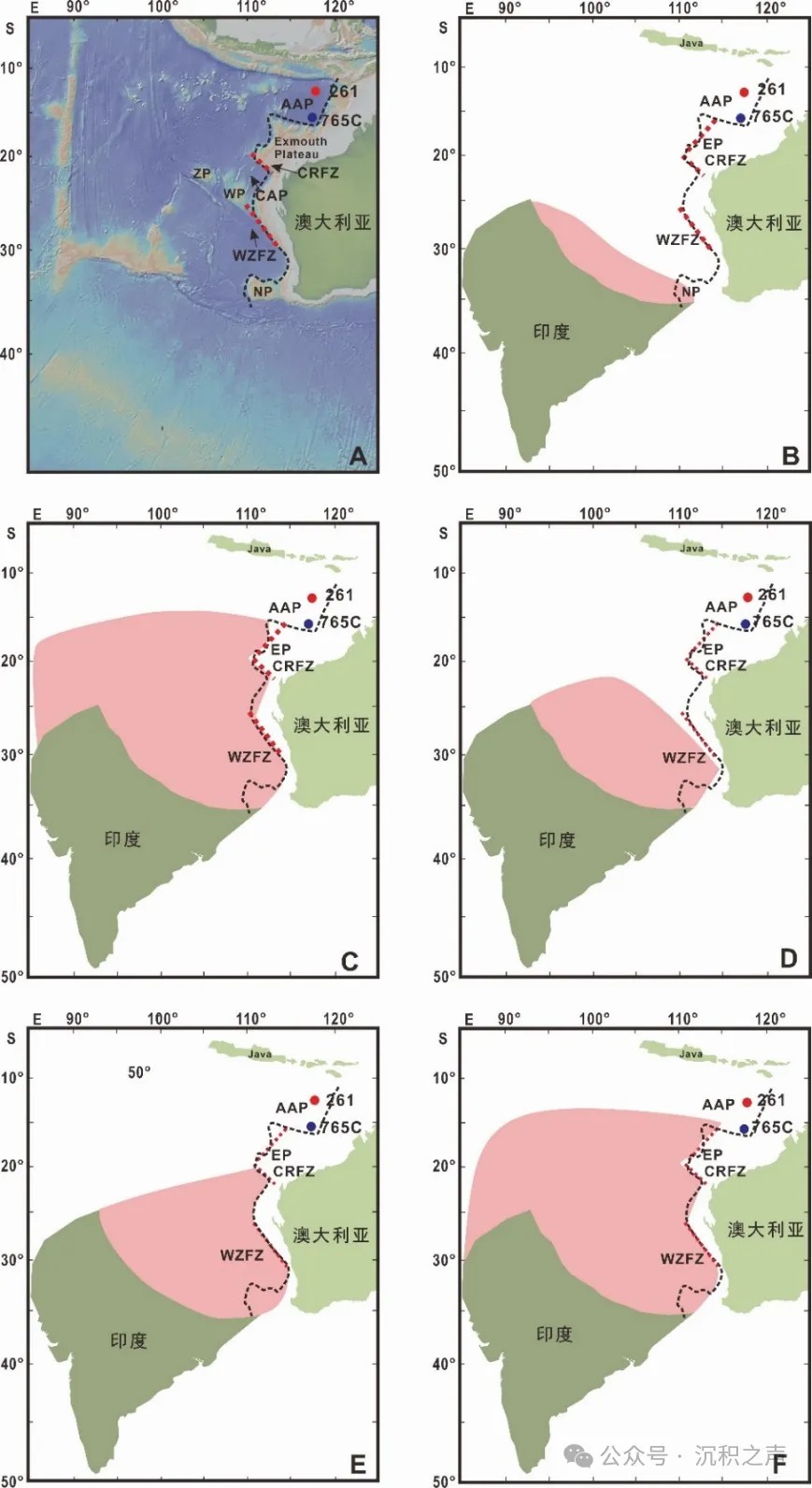 ↑ 图1 重建“大印度”的北部边界与澳大利亚西北缘的相对位置(AAP-Argo深海平原,EP-Exmouth Plateau,CRFZ-Cape Range断裂带,WZFZ-Wallaby-Zenith断裂带):A.西北澳大利亚北缘地形图;B. Ratschbacher 等(1994);C. Lee and Lawver(1995);D. Ali and Aitchison(2005);E. Powell等(1988);F. Ingalls等(2016)。