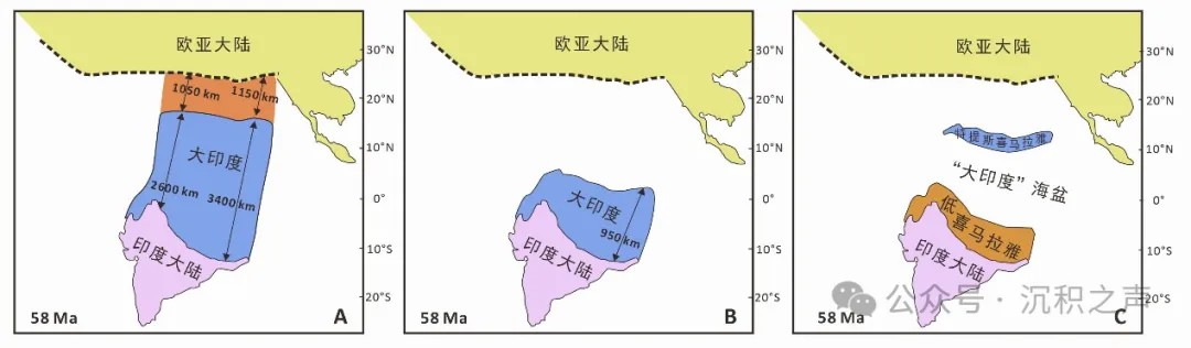 ↑ 图2 不同“大印度”北向延伸与碰撞模型:A. 陆陆碰撞模型,58 Ma亚洲岩石圈的缩短量和较大的“大印度”;B. 弧陆+陆陆两期碰撞模型,较小的“大印度”与蛇绿岩或者洋内岛弧先碰撞;C. 大印度洋伸展+双陆陆碰撞模型,特提斯喜马拉雅微陆块先与欧亚大陆碰撞。