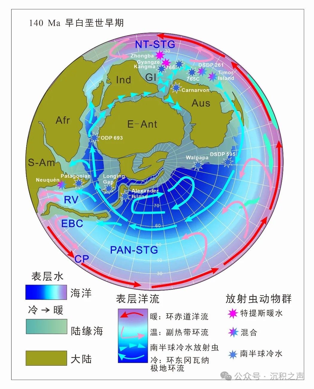 ↑ 图3 早白垩世早期(140 Ma)东冈瓦纳古地理图(依据PANALESIS模型)。图中指示了古洋流、南半球放射虫古地理分区和已有的南半球冷水放射虫动物群报道及其扩散轨迹。