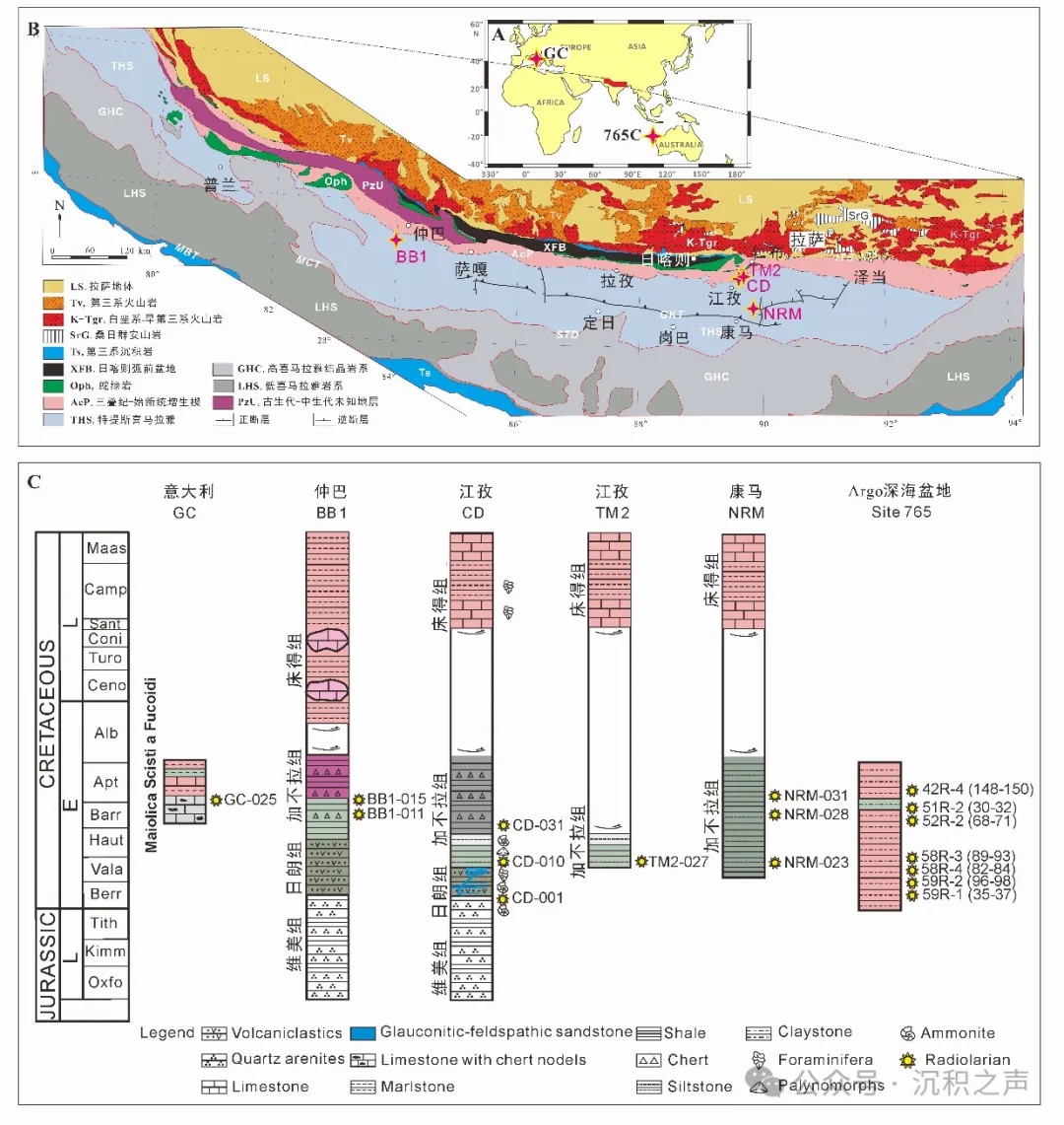 ↑ 图5 研究剖面及采样层位A. 采样剖面分布图;B. 雅鲁藏布江缝合带地质简图;