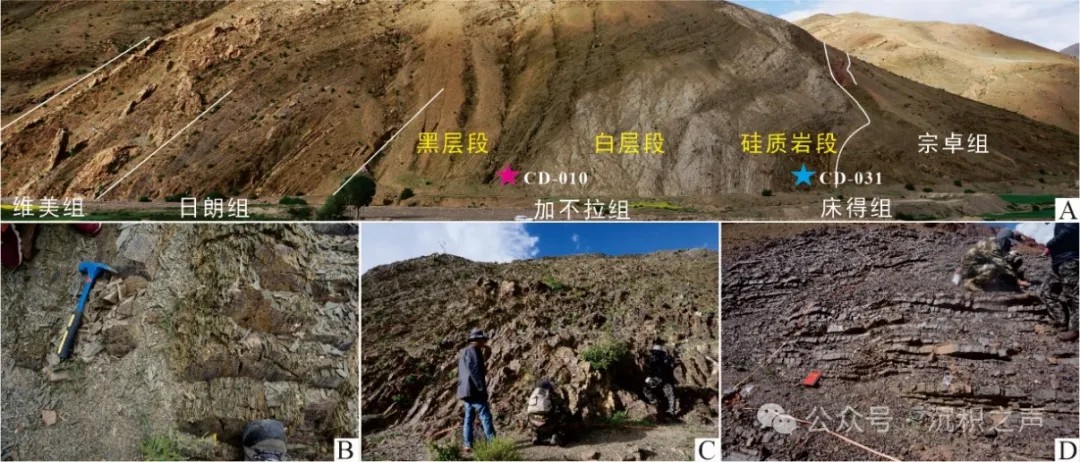 ↑ 图6 藏南江孜床得剖面和仲巴巴巴扎东剖面野外露头照片(A. 宏观照,B. CD-010,C. CD-031, D. BB1-011)。