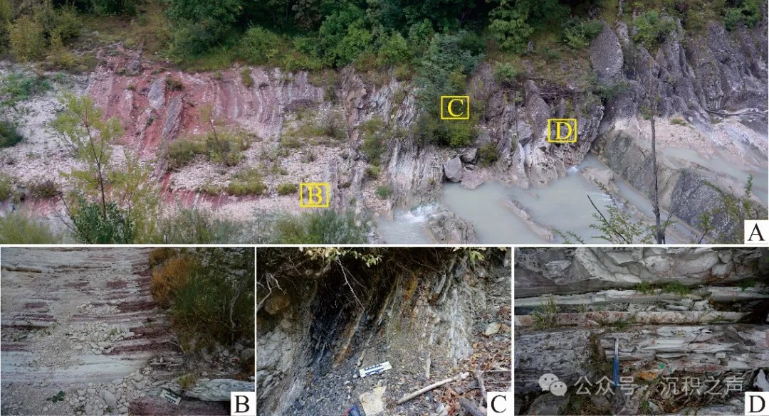 ↑ 图7 意大利Gorgo a Cerbara剖面野外露头照片(A. 宏观照,B. Marne a Fucoidi组多色泥灰岩,