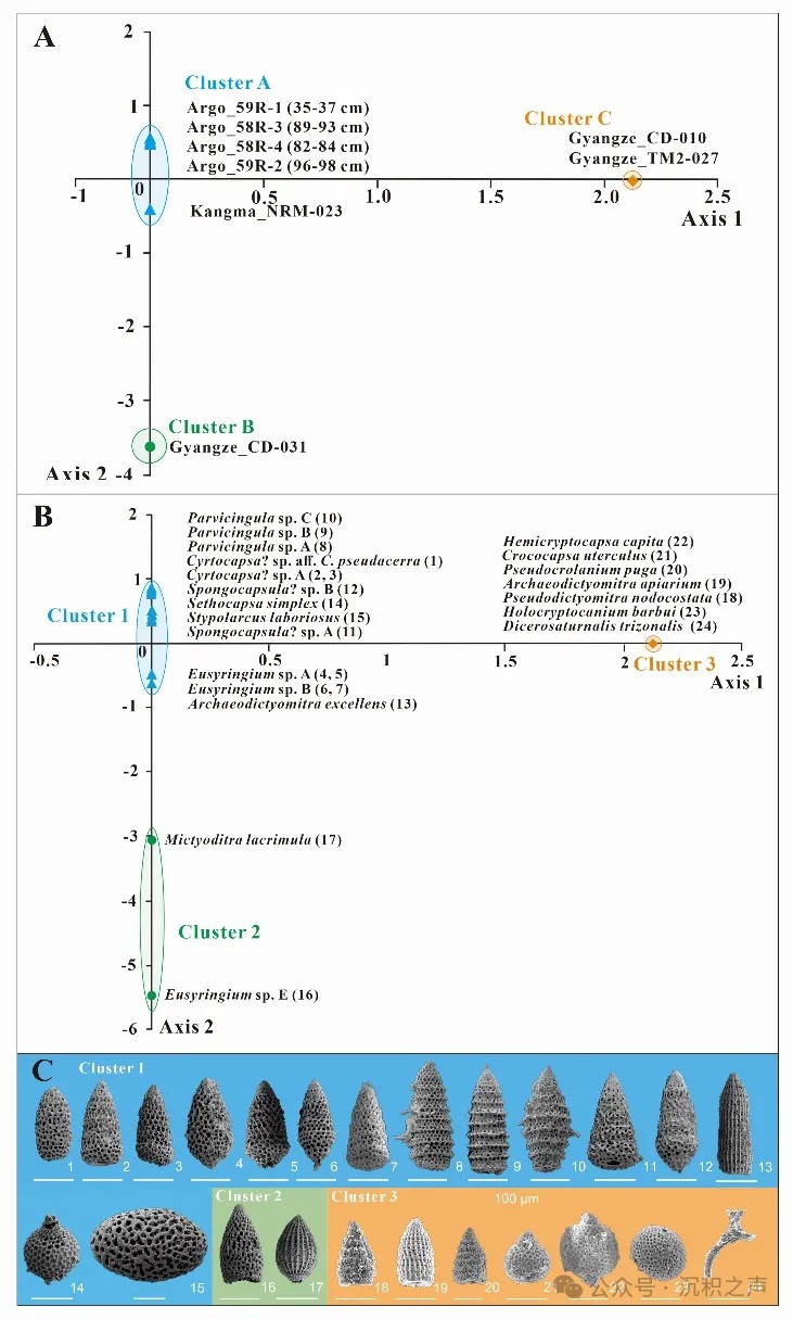↑ 图9 基于“Hayashi数量化理论III”数值分析法分析的早白垩世放射虫动物群和样品散点图
