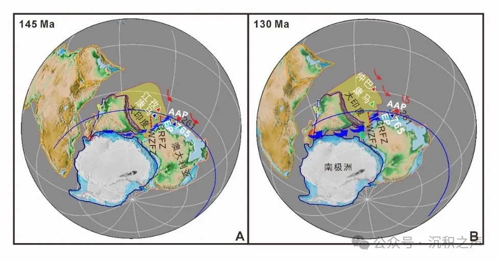 东冈瓦纳大陆主要由印度、南极洲、澳大利亚和其他一些微大陆组成,在中侏罗世与非洲大陆分离。早白垩世(大约1亿年前),随着澳大利亚西北处新的洋中脊扩张,印度大陆从南半球中高纬度地区向北漂移,在晚白垩世时期到达热带-亚热带区域,最终在新生代早期(大约6000万年前)与欧亚大陆碰撞,这个过程及其后续的持续挤压导致了青藏高原的形成,也直接影响了全球的古地理、古洋流和古生态(Stampfli and Borel, 2002)。