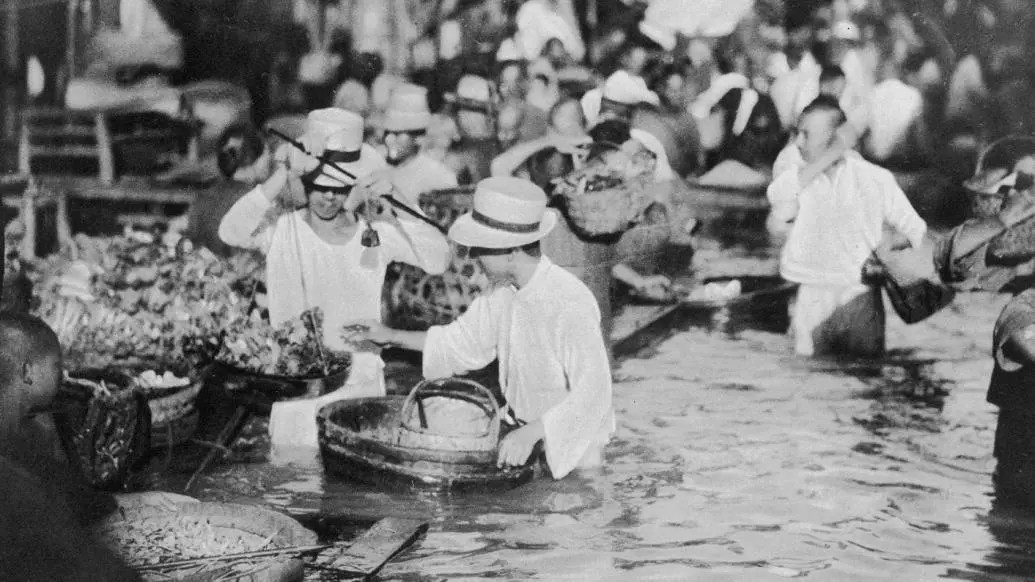 ↑ 图1 1931年洪水期间武汉的街头,市民们站在水里做生意。