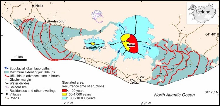 ↑ 图3 1918年冰岛溃决洪水的模拟结果(Gudmundsson,2015)