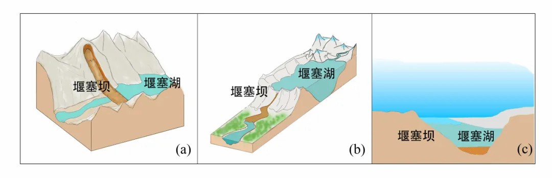 多种地质或人为过程会储蓄大量的水体,并且能够将其快速释放。对于溃决洪水的分类方法很多,其中依据储存水体的形态特征及其与坝体之间的关系,最有助于溃决洪水的分析。按照这一标准对溃决洪水进行分类,主要分为三类:第一,峡谷阻塞后溃决(图5a),其中既包括滑坡、泥石流、冰川和火山等自然过程,也包括人为修建的水电站,水库等。第二,注水的自然封闭盆地溢出,如构造盆地,冰上盆地,冰碛盆地等(图5b)。第三,封闭于岩层或者冰下的地下水体喷出(图5c),如火星上的地下湖,南极的冰下湖等。同一种地质过程可以形成不同类型的封闭水体,比如冰川作用,既可以阻塞河道,又可以形成冰上湖,还可以形成冰下湖(图6)。