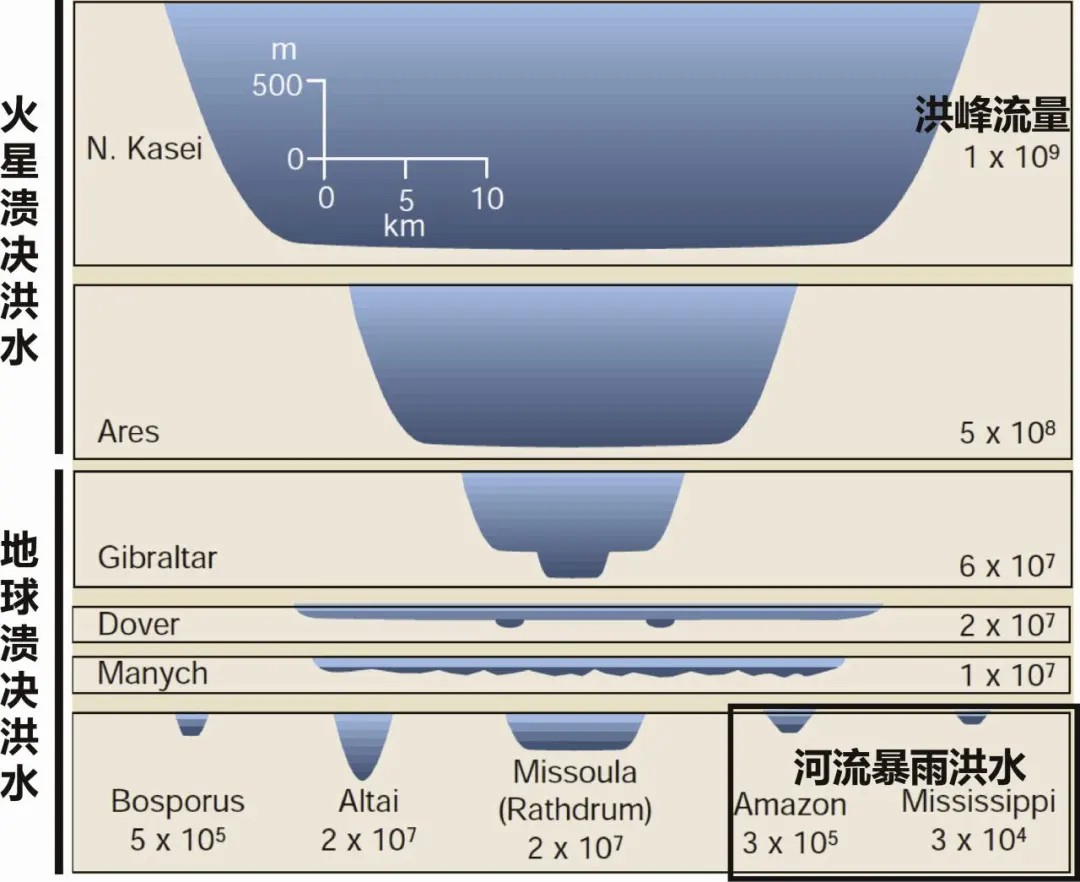 ↑ 图7 火星和地球溃决洪水水深、洪峰流量与河道断面概化图(Baker, 2001)