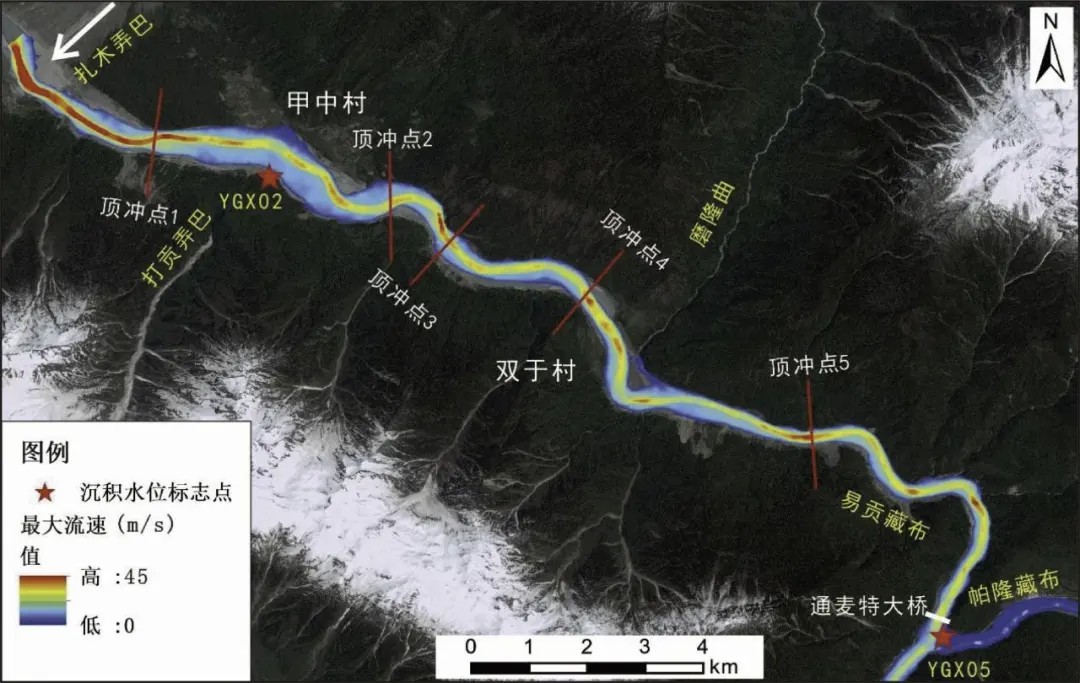 ↑ 图9 易贡2000年溃决洪水最大流速分布(吴朝华, 2022)