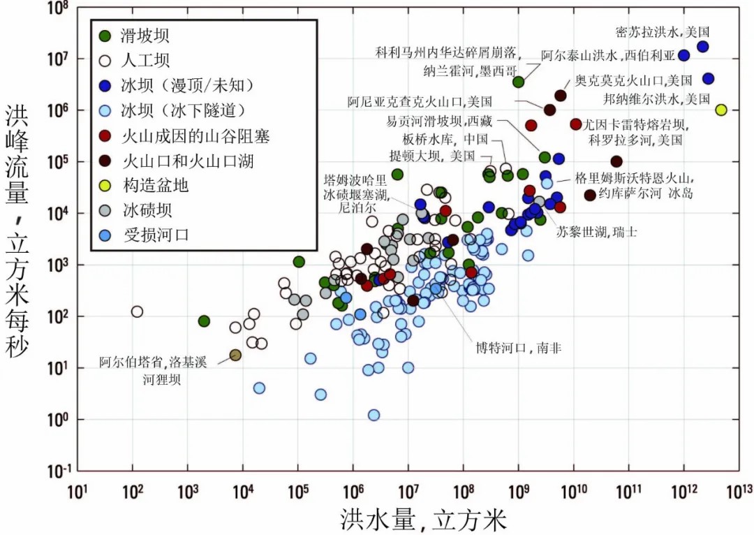 ↑ 图12 溃决洪水洪峰流量与释放水量的关系(O'Connor et al, 2022)