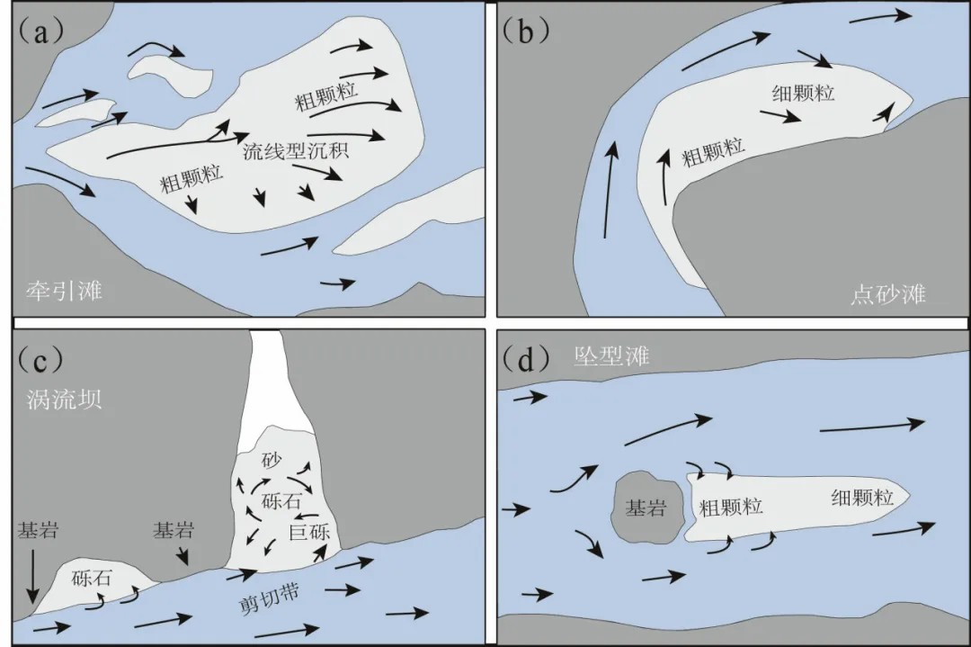 溃决洪水对坝体进行强烈侵蚀,会在坝体后面快速的沉积,如果地形允许,首先会形成堆积扇,然后沿程传输过程中在河道中流速降低的位置,形成河滩是其形成的主要沉积类型。根据地形不同,主要包含五种类型的河滩(图14):河道突然展宽,水动力减弱,下游发育扩展型河滩,该类沉积中部容易形成洼地和砂脊的相间分布;当河道转弯时,会在其凸岸形成,一般来流方向沉积物更粗;当遇到支沟时,会形成涡流,而形成涡流河滩;当支沟较窄时,可以完全堵塞支沟,也被称为拦门沙,当支沟较宽会主要分布与主河交汇的上侧;若河道中有障碍物,其背后会形成坠型滩,向下游方向粒度会变细。