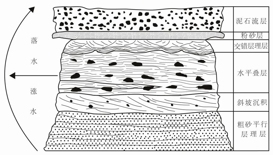 溃决洪水形成的河滩会随着涨水到消退,而呈现自己独特的沉积序列,会形成从底部到顶部的6个沉积单元的序列,其依次为粗的水平层理单元、大尺度的斜层理单元、水平层理薄层单元、粉砂层单元、泥石流盖层(图15)。这些单元不一定在一个沉积序列中都出现,也不一定只出现一次,并且这些沉积单元会具有漂砾、缺失粉砂和泥、韵律性等共有的特征。河滩的沉积序列详细描述与解读可为溃决洪水的水动力反演提供重要信息。