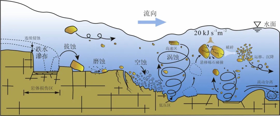 认识溃决洪水的侵蚀特征同样对追索溃决洪水的历史具有重要作用。火星很多宽大河谷是突然出现的,不像地球上的河网结构那样有河流从小变大的过程。在20世纪70年代,最初发现这种现象时,科学家便认定这些河谷为溃决洪水造成的,成为火星上有水的关键证据。溃决洪水对地表的侵蚀能造成地貌短期剧烈变化,这种剧烈变化会同时产生拔蚀、空蚀、涡蚀和磨蚀等多个高效侵蚀过程(图16)。