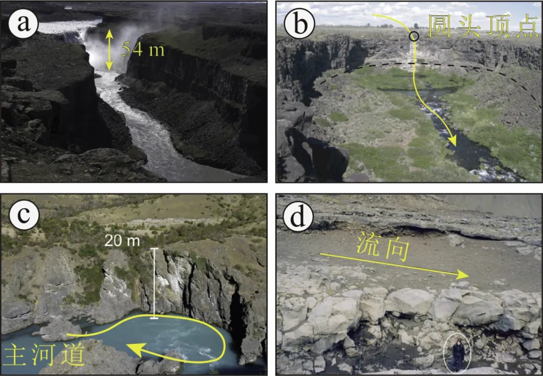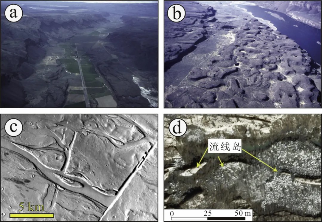 总体而言,根据地貌呈现的主导因素和尺度范围,宏观上可将溃决洪水侵蚀地貌分为大、中两种尺度地貌。其中,大尺度地貌上以缺乏河网结构的深谷,直交的峡谷网,拔蚀之后留下坚硬部分的丘盆状疤地(The Channel Scabland)和流线岛为典型(图17);中尺度地貌则包括突然出现的圆头峡谷以及数米的壶穴(图18)。