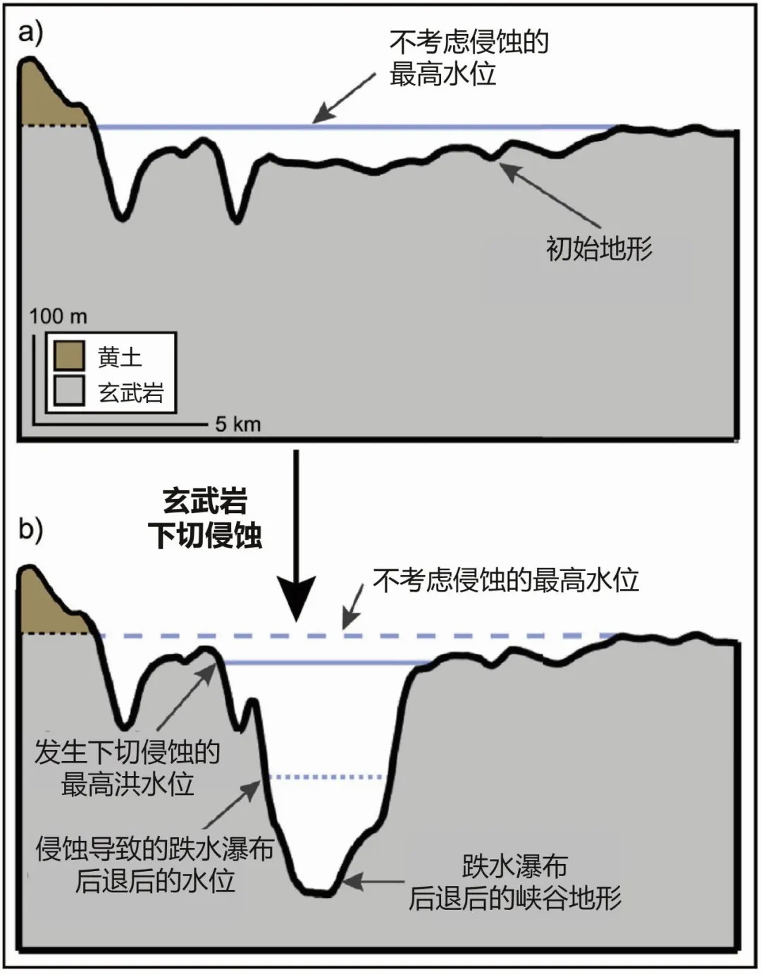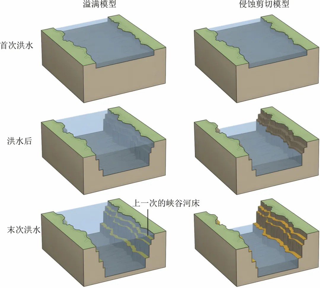 ↑ 图20 考虑溃决洪水侵蚀导致受跌水瀑布后退与峡谷受侵蚀的地形和洪水水位变化的示意图(Lehnigk and Larsen, 2022)