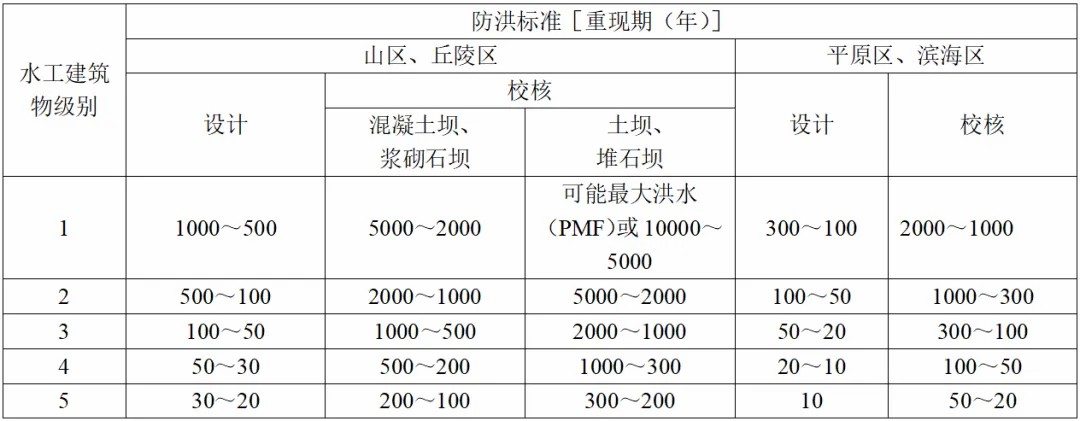表2 水库工程水工建筑物的防洪标准