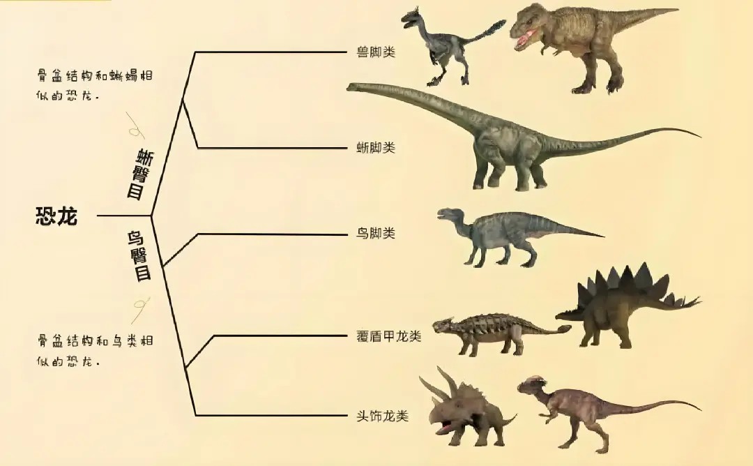 恐龙根据其腰带的结构,分为蜥臀目和鸟臀目,蜥臀目下又分为兽脚类和蜥脚类,鸟臀目下又分为装盾类、头饰类和鸟脚类。