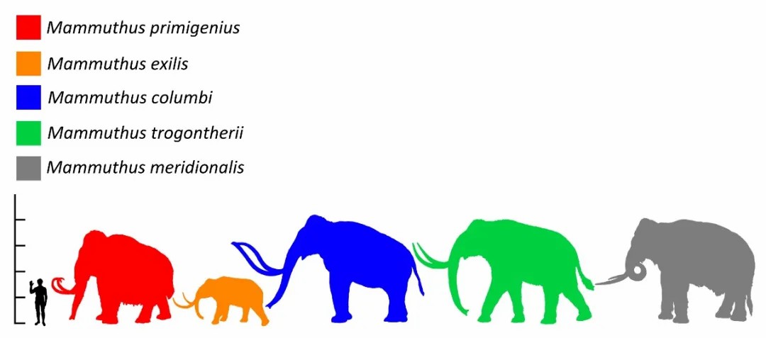 ↑ 人类与各种猛犸象的体型对比,其中Mammuthus primigenius(长毛猛犸象,已灭绝)高3.4米,Mammuthus exilis(侏儒猛犸象或海峡群岛猛犸象,已灭绝)高1.8米,Mammuthus columbi(哥伦比亚猛犸象,已灭绝),Mammuthus trogontherii(草原猛犸象,已灭绝),Mammuthus meridionalis(南方猛犸象,已灭绝)4米高|图片来源:Sergiodlarosa/Wikimedia Commons