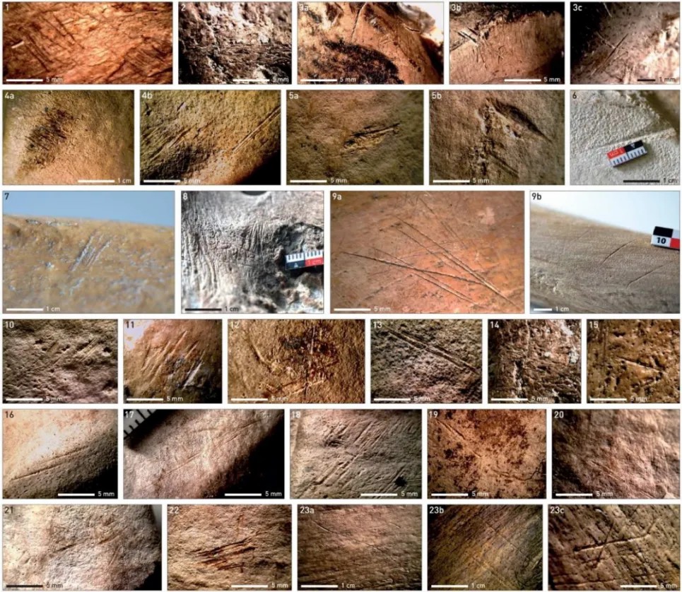 ↑ 12.5万年前,尼安德特人在古棱齿象骨骼上的切割痕迹。这些骨骼发现于欧洲北部平原的Neumark-Nord地区,尼安德特人在那里繁衍了数十代,生活时间超过2000年,肢解和食用重达13吨的大象似乎他们的文化技能之一|图片来源:Sabine Gaudzinski-Windheuser et al., 2023。