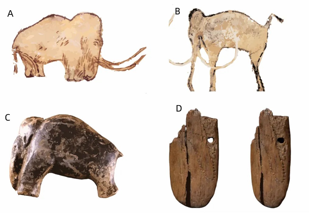 ↑ 古人类围绕猛犸象的艺术创作:A,2万年前,位于法国Rouffignac洞穴内的猛犸象壁画|图片来源:revive & restore;B,3万年前,位于法国南部地区Chauvets洞穴的猛犸象壁画|图片来源:revive & restore;C,3.5万年前,来自德国Swabian Jura高原的猛犸象小雕像|图片来源:revive & restore;D,4.15万年前,在波兰发掘的猛犸象象牙制成的吊坠碎片,被认为是迄今为止欧亚大陆最古老的复杂珠宝|图片来源:Sahra Talamo et al. 2021