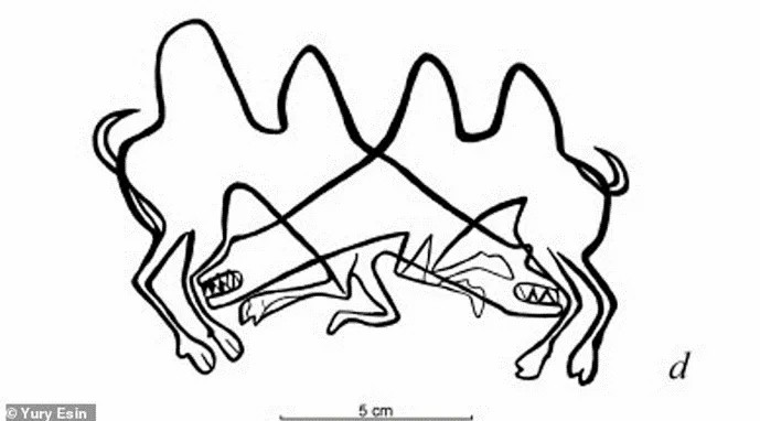 ↑ 大约1.3万年前,在西西伯利亚西部的tom river地区,打架中的骆驼雕刻画|图片来源:Yury N. Esin et al., 2020