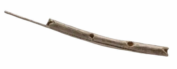 ↑ 3.5万年前,发现于德国Geissenklösterle洞穴的猛犸象象牙笛子,这是世界上最古老的人造乐器之一。它由两片雕刻挖空的猛犸象象牙组成,至少有三个指孔,可以演奏五声音阶|图片来源:Smithsonian National Museum of Natural History