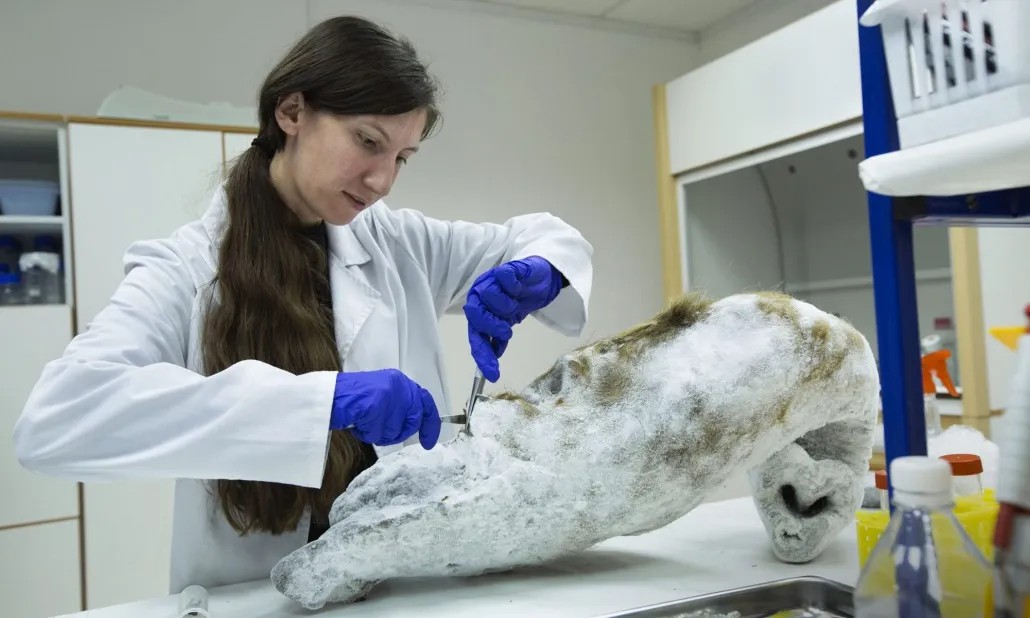 ↑ 在西伯利亚雅库茨克的猛犸象博物馆,埃里奥娜·海索利(Eriona Hysolli)正从一只冷冻的猛犸象躯干中采集组织样本