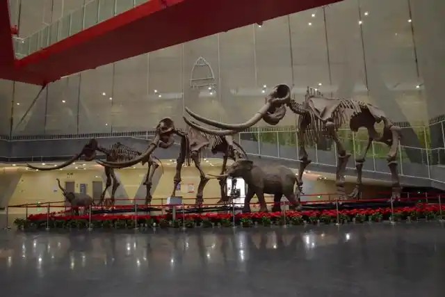 安徽蚌埠市博物馆的三具古菱齿象复原骨架以及两只模型象