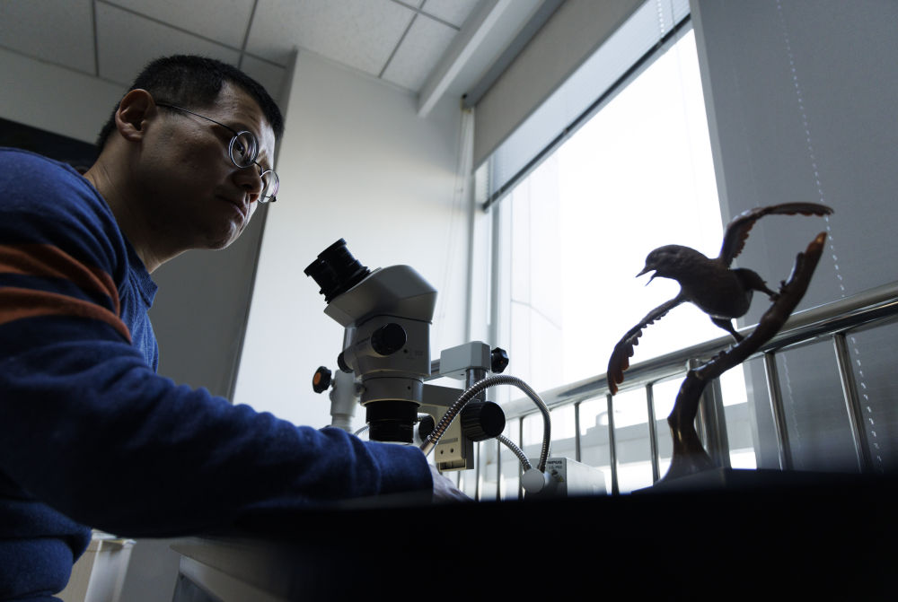 2月10日,古脊椎所王敏研究员在办公室观察政和八闽鸟标本,右侧是政和八闽鸟模型。新华社记者 金立旺 摄