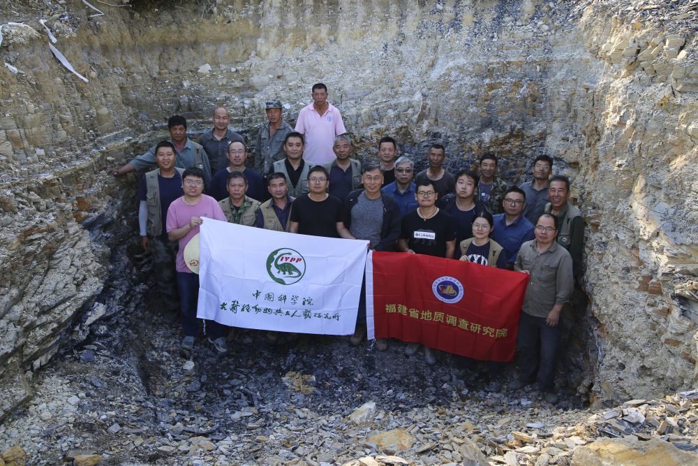 古脊椎所和福建地调院联合考察队队员在位于福建政和县的野外考察和发掘现场合影留念(2023年11月5日摄)。新华社发(古脊椎所供图)