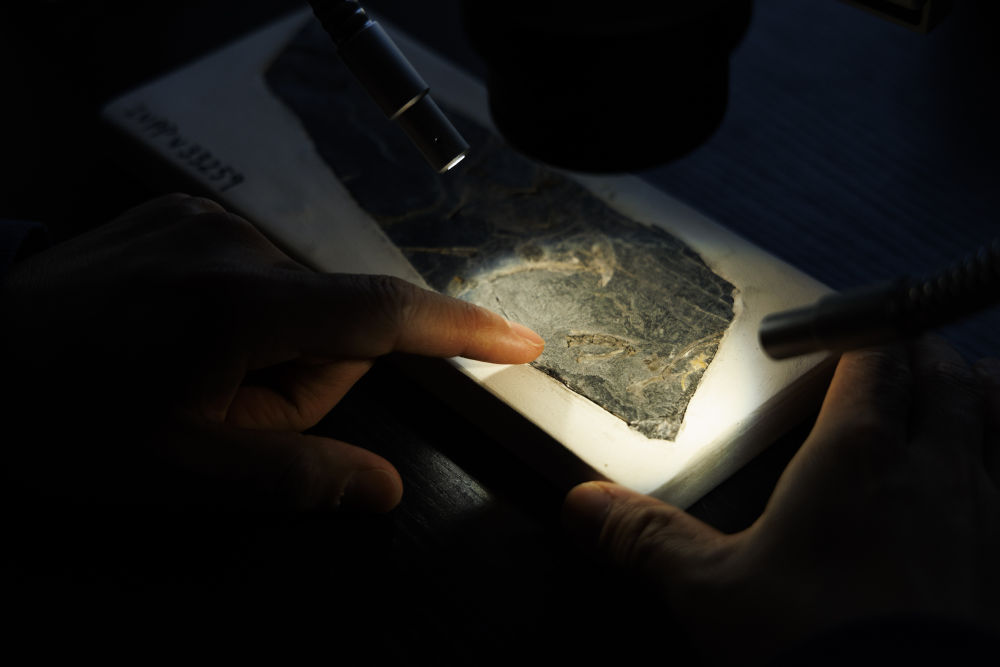 2月10日,古脊椎所王敏研究员在办公室观察政和八闽鸟标本,左手手指指示部位即是政和八闽鸟的尾综骨。新华社记者 金立旺 摄