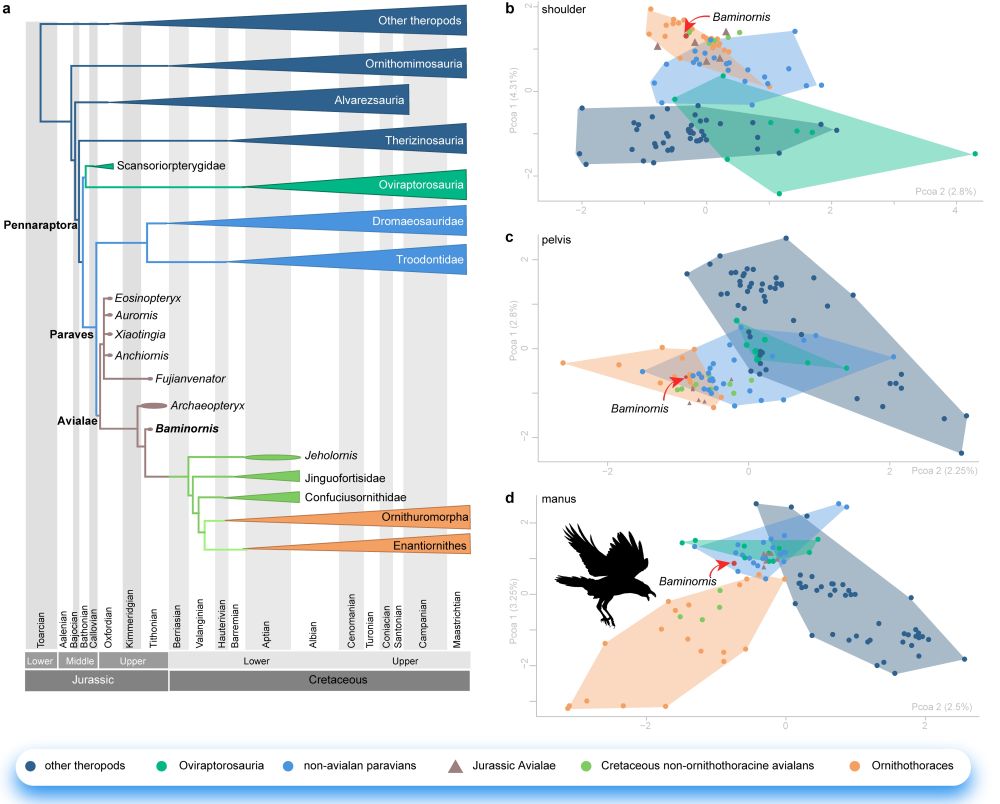 中生代兽脚类恐龙(包括鸟类)演化树,以及前肢、肩带和后肢的形态空间。新华社发(王敏供图)