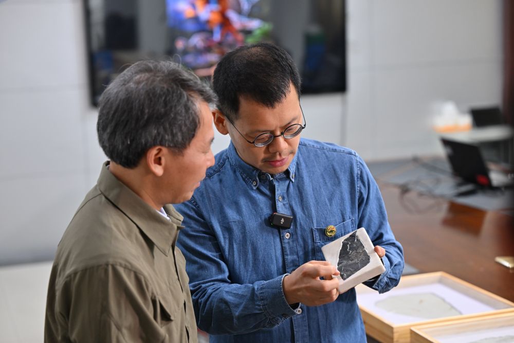 2月11日,古脊椎所王敏研究员(右)与福建地调院教授级高工陈润生在福建地调院查看政和八闽鸟标本复制样本。新华社记者 姜克红 摄