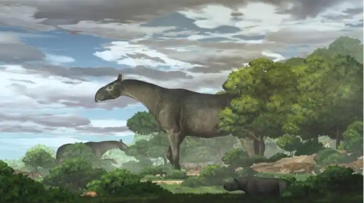 和政动物群之临夏巨犀在渐新世晚期的生态复原图。新华社发(中国科学院古脊椎动物与古人类研究所供)