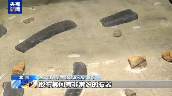 国家自然博物馆副研究员 魏屹:灰色的是一头草原猛犸象的骨骼,散布其间有非常多的石器,包括石核、石片,还有一些刮削器等。其中,有一个刮削器,在出土的时候,还保持着和动物化石密切接触的状态。另外,在很多骨骼上面,我们发现有非常明显的砍砸,还有切割的痕迹,所以说明当时古人类可能在这里进行过石器的加工,并且用加工之后的工具对草原猛犸象进行了肢解、切割还有餐食的活动。距今大约166万年,我们把这个场景称为“东方人类的第一餐”。