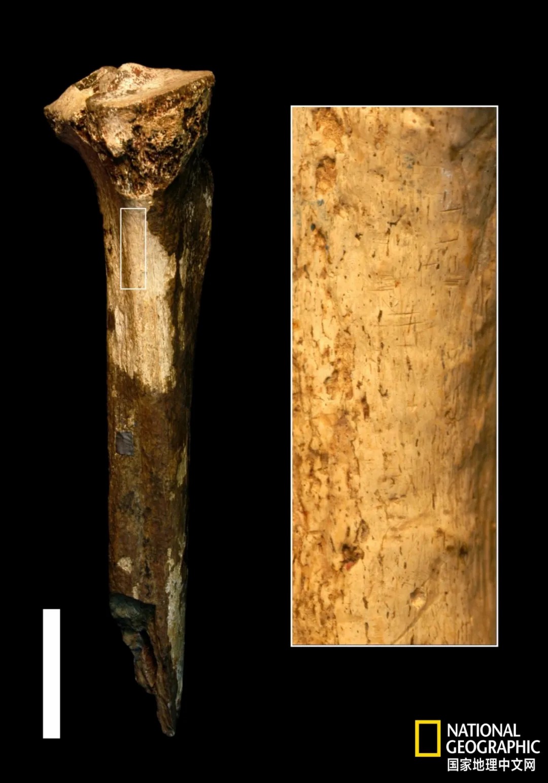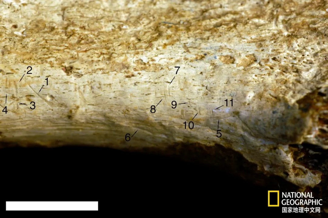 在一块有着145万年历史的胫骨上的切割痕迹表明,当时人们曾使用石器工具来切割这条腿以获取其肉。|国家地理图片集