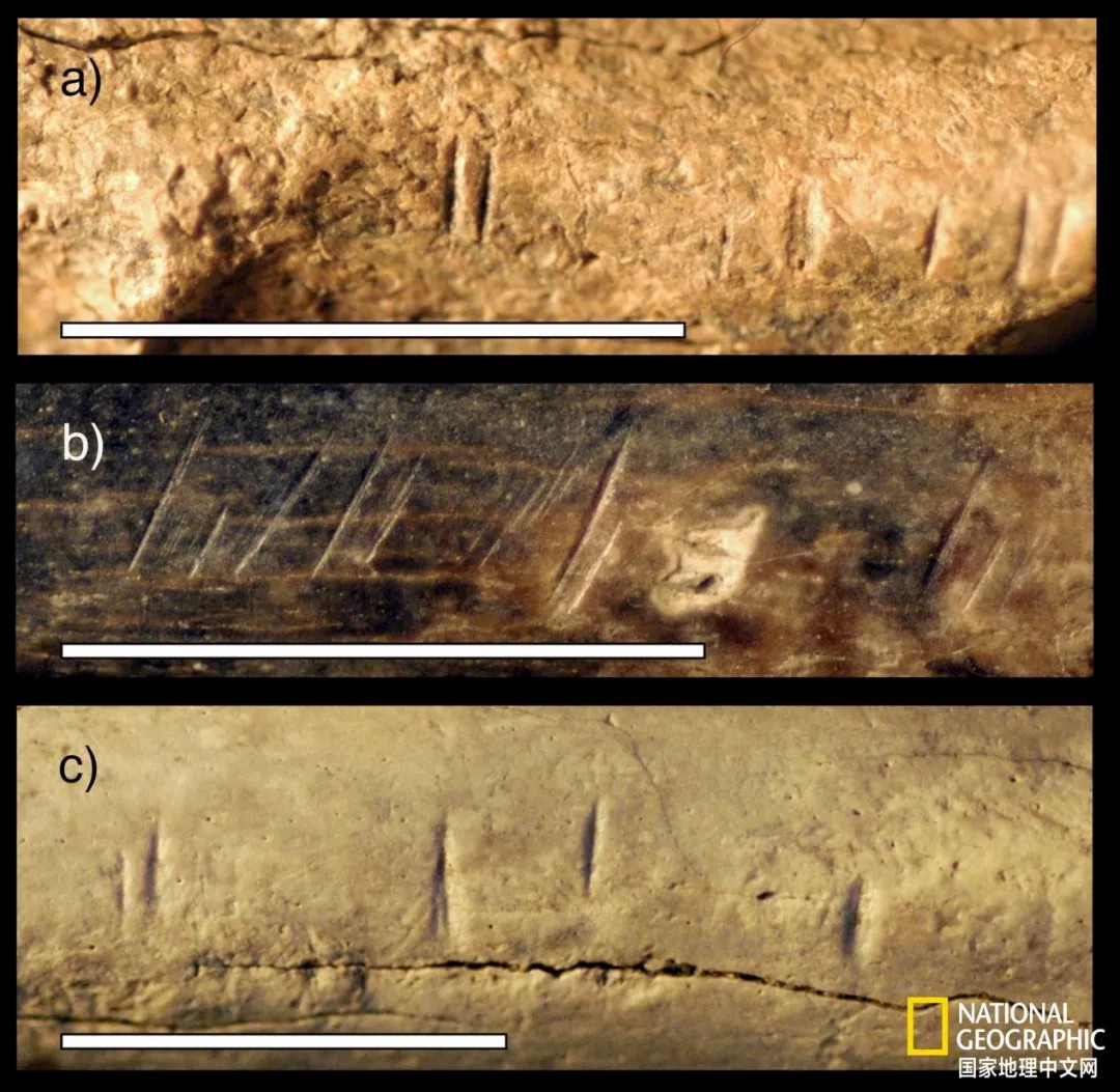 与那根古人类胫骨来自同一地区、同一时期的三个动物化石标本的特写照片,显示出类似的切割痕迹。