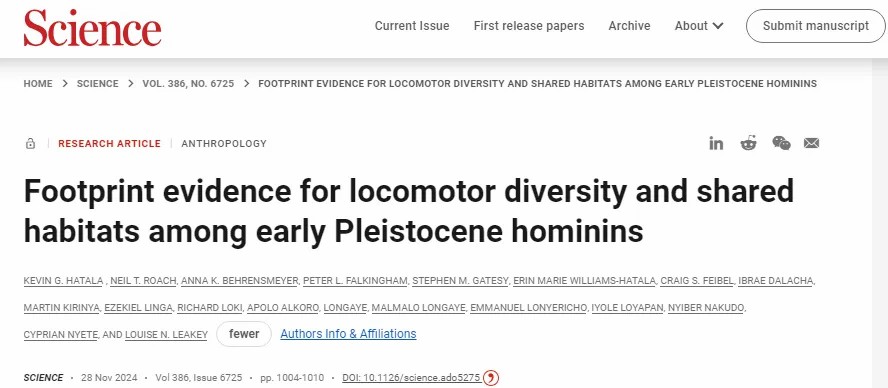 [1] Kevin G. Hatala et al. ,Footprint evidence for locomotor diversity and shared habitats among early Pleistocene hominins.Science386,1004-1010(2024).DOI:10.1126/science.ado5275