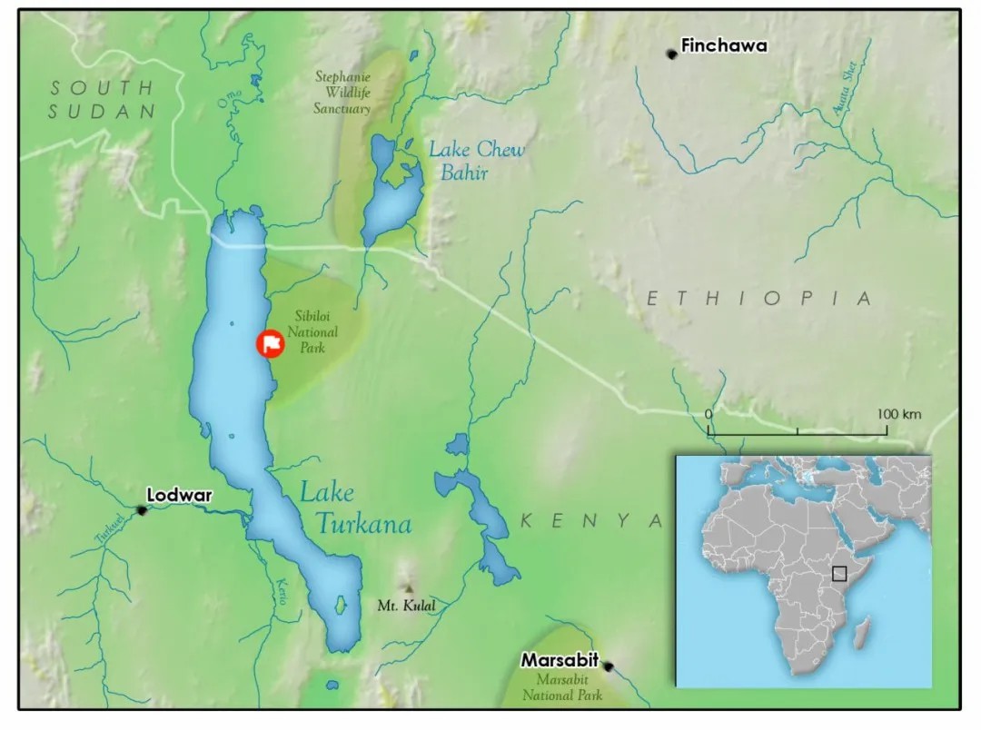 图尔卡纳湖(Lake Turkana)位于图尔卡纳盆地的中心,图中旗帜表示此次化石发现的地点