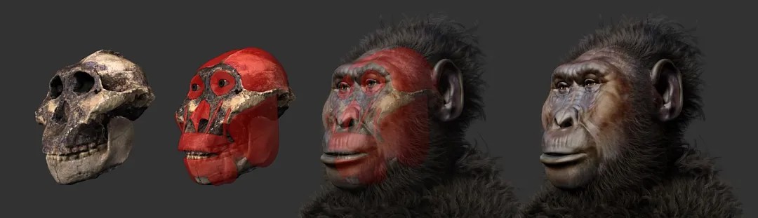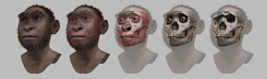 鲍氏傍人的面部复原过程,其头骨形态与现代人差别很大,下颌更大,牙齿粗壮,头骨顶部存在矢状脊
