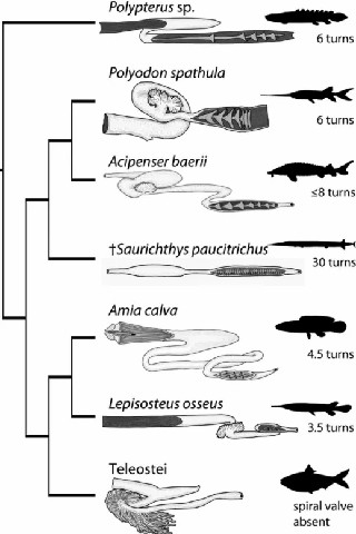 这一观点并非异想天开,因为现生鲨鱼、肺鱼、银鲛、鲟类的肠道就有这样的结构:回肠内的粘膜层排列成螺旋瓣,就像一个螺旋楼梯。当食物兴冲冲来到螺旋瓣后,一圈又一圈的结构不仅可以延缓食物的移动速度,还能增加肠道内的消化面积,让鱼儿们更充分地吸收营养。