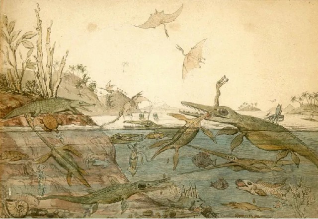 这幅1830年的水彩画,展现了侏罗纪时期的莱姆里吉斯海岸,主要基于威廉·巴克兰的科学研究和玛丽·安宁收集的化石,是重建古代生态系统的第一次尝试。不信你看,蛇颈龙和鱼龙互相厮打的同时,还在悄悄拉屎——蛇颈龙腹下的椭圆状物体就是粪便。