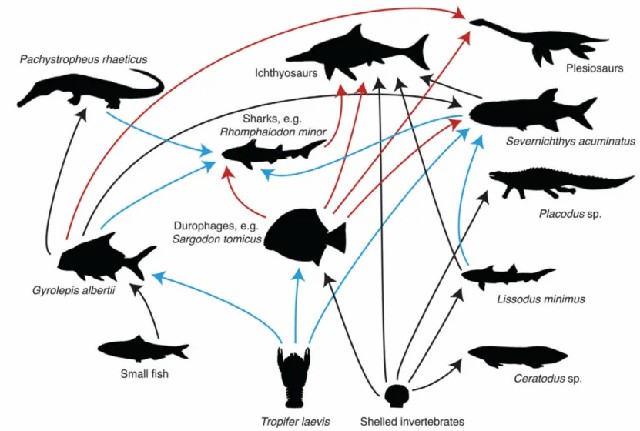 顶部为鱼龙,右上角为蛇颈龙,蓝色箭头表示2020年研究的捕食者-猎物关系,红色箭头和黑色箭头来源于2018年的研究。图片来源:参考文献[3]