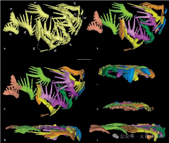 这些标本帮助我们建立了两类重要的多分子器官模型:司克泰舟石属(Scythogondolella)和小厚颚石属(Hadrodontina)。经三维重建后,它们均由15分子组成,呈现出两侧对称的结构,但分子形态区别很大。其中,司克泰舟石属的多分子器官由15分子(包括8种形态型)组成,口后方咽部由舟型牙形石形成剪刀状结构,口前端的指掌状牙形石分子与舟石超科中其他属相似形态型在器官中所处的位置具有同源性;小厚颚石属由15分子(包括7种形态型)组成,口后方拥有与舟型牙形石完全不同的形态类型,特征是两对相似的三角状牙形石,前段由延长的指掌状类型构成。小厚颚石属多分子器官是目前世界上已知的锯片石亚目中保存最丰富和最完整的,为将来研究该类群提供了研究模板。