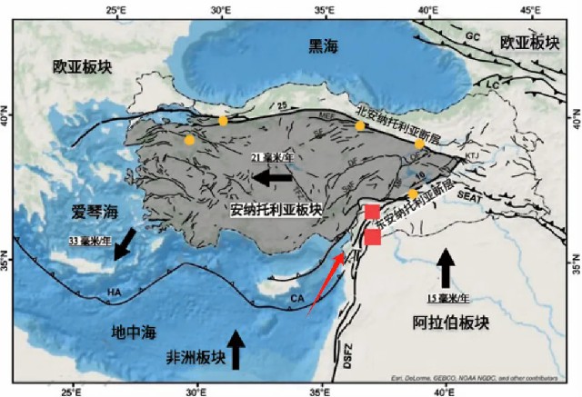 红色箭头为安塔基亚的大致位置,黄色圆标表示历史上曾发生过的7级以上地震