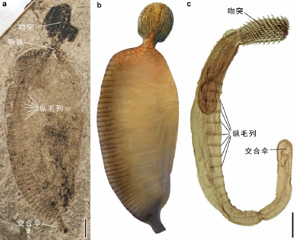 图5 本次发现的神秘蠕虫(侏罗虫)(a, b)与现代棘头虫(c)的比较
