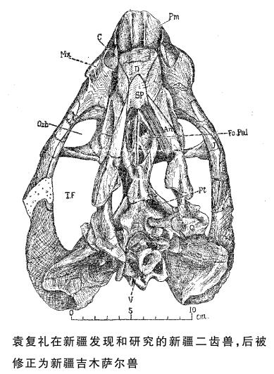 袁老师当年采集的标本仅古脊椎动物一项就有72具之多,经研究分属于许多新的种属。这是半个多世纪以前他个人发掘所得。如果把他的工作与他以前的人在新疆的工作来比,那当然是前无古人了,就是与他以后的人的工作来比虽然不能说是后无来者了,在这半个多世纪以来,众多的地质学家和古生物学家所获得的材料虽然不少,也有一些新种新属的发现,但从古生物学来说超出袁老师所获得的范围确实不算是很多。新疆中生代古脊椎动物学的面貌可以说在袁老师的工作的基础上已经有了一个轮廓了。至于它在地质学和古生物学上的重要意义,就不在此多说了。